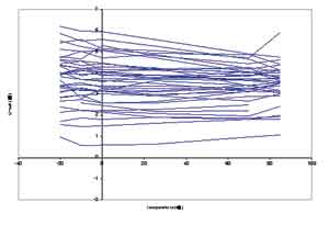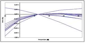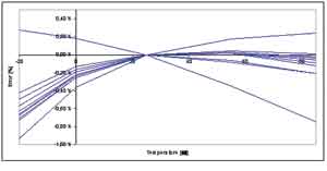 為了在各種溫度變化下獲得更好的性能,愛特梅爾增加了一個額外的基準(zhǔn)電壓校準(zhǔn)機(jī)制,用以調(diào)節(jié)帶隙基準(zhǔn)源的溫度系數(shù)。這個校準(zhǔn)步驟將調(diào)節(jié)曲率的形狀和位置,并顯著改善隨溫度變化的穩(wěn)定性,如圖4所示,在-20~+85℃溫度范圍內(nèi)的最大變化是0.5%。注意第二個校準(zhǔn)步驟可以檢測和顯示出具有截然不同的曲線形狀的離群點。