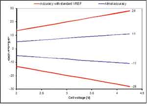 BM器件中常用的標(biāo)準(zhǔn)帶隙基準(zhǔn)源針對額定變化被校準(zhǔn),在25℃時的精度極高。然而,曲率形狀和位置變化的補(bǔ)償也相當(dāng)常見,這就產(chǎn)生與溫度變化有關(guān)的大幅變化,使得在高和低溫時電池電壓測量不夠精確。此外,也不可能檢測和顯示出曲線形狀顯著不同的離群點。
