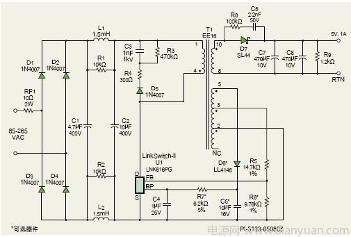圖2是一款5W通用輸入恒壓/恒流(CV/CC)充電器/適配器的電路設(shè)計圖。本設(shè)計適用于手機電池充電器、USB充電器或任何有恒壓/恒流特性要求的應(yīng)用。該電路可為最高1A的負載提供5V恒流輸出,精度為±5%。當需要更大負載時,電源將進入恒流模式,輸出電壓降低,使輸出電流維持在1A±10%。