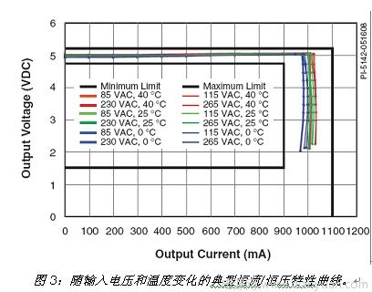 這個電源電路是采用PI的LinkSwitch-II系列產(chǎn)品LNK616PG(U1)而設(shè)計的反激式電源。它不是傳統(tǒng)的PWM控制器,而是采用開/關(guān)控制來維持恒壓(CV)階段的穩(wěn)壓。它通過跳過開關(guān)周期來維持輸出功率水平,并通過調(diào)節(jié)使能與禁止開關(guān)周期的比值和初級限流點來維持穩(wěn)壓。這種控制方法在充電器設(shè)計中具有諸多獨特優(yōu)勢。隨著負載電流的增大,電流限流點也將升高,跳過的周期也越來越少,達到最大輸出功率點時將不再跳過任何開關(guān)周期。當需要進一步提高功率時,輸出電壓會隨之下降。控制器檢測到壓降后進入恒流模式。 在此模式下,隨著電流需求的增大,開關(guān)頻率將下降,從而實現(xiàn)線性恒流(CC)輸出。圖3給出了該電路的電流及電壓性能。