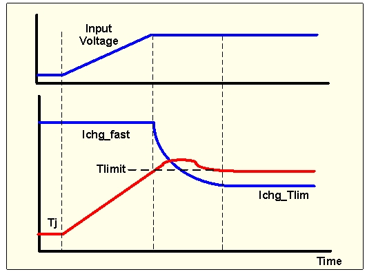 為解決此類散熱問題,可添加一個散熱環路,以降低充電電流并確保IC結點溫度低于熱關斷閾值。為bq2406X系列線性充電器添加了散熱環路的運行如圖2所示。散熱環路在激活狀態下可有效降低充電電流,降低充電器級功率MOSFET的功耗。