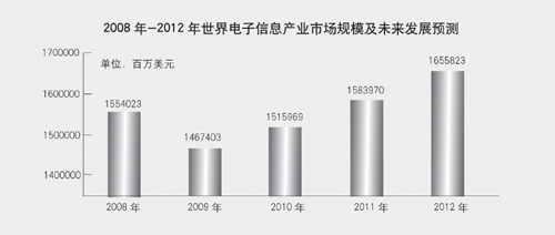 2010年,全球電子信息產(chǎn)業(yè)將逐步回暖并步入全面復蘇階段。根據(jù)《世界電子數(shù)據(jù)年鑒》預測,未來3年,全球電子信息產(chǎn)業(yè)市場規(guī)模將維持3%-4%的增幅,預計2010年市場規(guī)模將達到15159.7億美元,2012年將達到16558.2億美元。同時,未來3年信息技術(shù)應用將進一步深化,信息技術(shù)的廣泛滲透和深度應用將催生出一批新的增長點;綠色IT將成為未來發(fā)展重點,綠色信息技術(shù)在節(jié)能減排、低碳經(jīng)濟中將發(fā)揮重要作用;企業(yè)并購重組步伐加快,新興市場拓展將成為電子信息產(chǎn)業(yè)發(fā)展的另一個重要引擎。