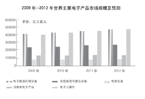 未來3年內(nèi),電子數(shù)據(jù)處理設備、電子元器件、無線通信產(chǎn)品和消費類電子產(chǎn)品份額仍將占據(jù)世界電子產(chǎn)品份額的前4位。2009年上述4種電子產(chǎn)品所占比例分別是28.18%、27.99%、16.37%、9.20%。其中電子數(shù)據(jù)處理設備和消費類電子產(chǎn)品所占份額分別比2008年提高了0.77%和0.33%。未來3年內(nèi),世界主要電子產(chǎn)品所占份額的比重基本保持穩(wěn)定,電子元器件所占比重略有增加,預計將由2009年的27.99%增加到2012年的28.89%,電子數(shù)據(jù)處理設備將由28.18%增加到28.43%。