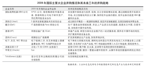 2009年,世界主要IT企業(yè)為應對國際金融危機,紛紛通過并購戰(zhàn)略整合優(yōu)勢資源,開拓新興市場,實施產(chǎn)品多元化發(fā)展,從而提升行業(yè)戰(zhàn)略地位和自身的競爭力。未來3年這種發(fā)展態(tài)勢仍會繼續(xù)。