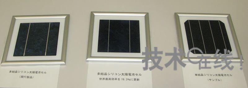 左起依次為現(xiàn)有的多晶Si電池單元、單元轉(zhuǎn)換效率為19.3%的多晶Si電池單元,以及此次宣布涉足市場(chǎng)的單結(jié)晶Si電池單元(樣品)。
