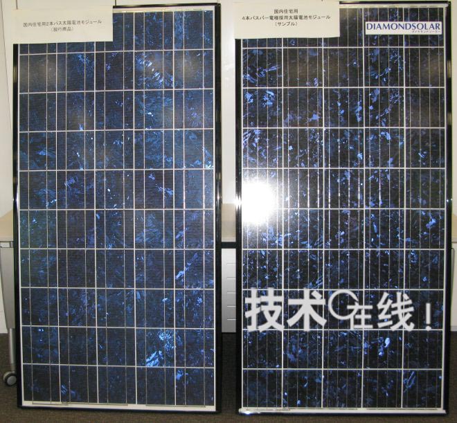現(xiàn)有的輸出功率185W多晶Si型面板(左)和將于2010年6月投放日本市場(chǎng)的190W多結(jié)晶Si型面板。通過(guò)將各單元上作為電極的總線布線從2根增至4根,提高了輸出功率。