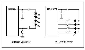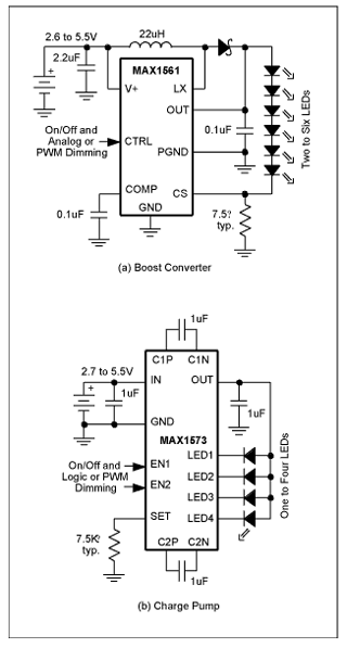 圖1.MAX1561升壓轉換器(a)和MAX1573電荷泵(b)是2種LED供電方案。電路復雜度基本相同,但電荷泵不需要電感。