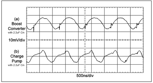 圖5.如果開關頻率為1MHz,驅動同樣數量的LED,采用相同的輸入電容,那么電荷泵(b)和升壓轉換器(a)的輸入紋波基本相同。然而,由于電荷泵與LED之間有較多引線,建議使用更短的連線(天線),另外,泵電容產生的EMI低于升壓轉換器的電感。