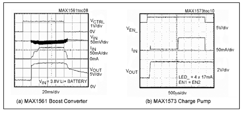 圖6.MAX1561升壓轉換器(a)和MAX1573電荷泵(b)的軟啟動和關斷波形都表明沒有輸入過沖電流(IIN),使電池跌落最小,以免對系統的其它電路造成影響。