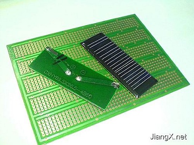 圖7是制成后的太陽(yáng)能供電板,制成后就可以給一些小東西供電了,比如手電筒、收音機(jī)之類的。接幾個(gè)白色高亮LED,就成為一個(gè)太陽(yáng)能LED手電筒,圖8是太陽(yáng)能供電板點(diǎn)亮高亮LED的情景。