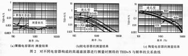 在音頻電路中經常采用陶瓷電容器作為交流耦合元件,在低頻提升和濾波電路中也大量使用。圖2(C)所示測試曲線類似于圖2(b),所不同的只是采用了表2給出的三種陶瓷電容器做測試。