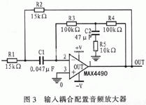 圖3示出一種新穎的輸入耦合配置音頻放大器允許采用較小容值的COG/1206陶瓷電容器作為輸入耦合電容器,以最大限度地降低電壓系數的影響,適用于便攜式音頻放大器。復合反饋環路基本上具有一階的低頻衰減響應,但是它民可以調整為兩階響應的高通濾波器。調整圖3中的相關無源元件時需要注意放大電路的過載響應和與之相關的峰值。圖示電路具有近似的最大平坦度高通響應。這個電路可以簡單運用到偽差分和全差分輸入級放大電路設計中。