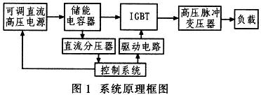 系統(tǒng)工作過程如下:由控制系統(tǒng)控制可調(diào)直流高壓電源給儲能電容器充電,當充電電壓達到設(shè)定值后,再控制IGBT按照設(shè)定的頻率和脈沖寬度導(dǎo)通,產(chǎn)生脈沖電壓加在高壓脈沖變壓器原邊,最后由高壓脈沖變壓器升壓,產(chǎn)生所需的高壓脈沖加在負載上。