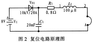 圖2中,V1為低壓直流電源,R1為限流電阻。由V1通過R1提供一個直流電流給單匝復(fù)位線圈A。在高壓脈沖變壓器工作時,單匝線圈A上會感應(yīng)較高的電壓,利用電感L1,電容C1和高壓硅堆VD1對低壓直流電源V1進行保護。