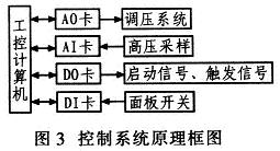 控制系統(tǒng)原理框圖如圖3所示。通過計算機控制AO卡(模擬量輸出)輸出0~10V的模擬量,用來控制調(diào)壓系統(tǒng)中的可控硅調(diào)壓器的輸出。儲能電容器上的電壓經(jīng)過高壓采樣和AI卡(模擬量輸入),由計算機采集。計算機控制DO卡(數(shù)字量輸出)輸出控制信號控制各類啟動開關(guān)和IGBT驅(qū)動板輸出觸發(fā)信號。各類手動面板的開關(guān)信號經(jīng)過DI卡(數(shù)字量輸入),由計算機采集。