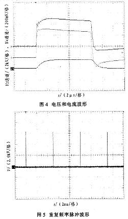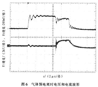 圖4中,縱坐標為電壓幅度值(2通道2kV/格,4通道200mV/格)。通道2為電壓波形,電壓約為5kV,脈沖寬度為10μs,上升沿小于lμs。通道4為電流波形,電流值約85A(波形圖中比例為l:500)。圖5中,脈沖周期為5ms,重復(fù)頻率為200Hz。圖6中,縱坐標為電壓幅度值(1通道5kV/格,2通道2V/格)。l通道為放電電壓波形,2通道為放電電流波形。從波形圖中可以看出,脈沖當電壓加在氣體上時,大約經(jīng)過幾微秒時間后,氣體發(fā)生電離。此時由于分壓原因,電壓幅值略有下降,電流波形開始出現(xiàn)。在脈沖電壓加載期間,氣體維持了電離狀態(tài)。