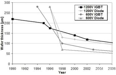 由于導通電壓和關(guān)斷損耗在很大程度上取決于晶圓的厚度,因此需要做更薄的IGBT。圖4顯示了英飛凌600/1,200VIGBT和EMCON二極管的晶圓厚度趨勢。對于新型1,200VRC-IGBT而言,120um厚度晶圓將是標準工藝。這需要進行復雜的晶圓處理,包括用于正面和背面的特殊處理設(shè)備。將晶圓變薄可通過晶圓打磨和濕式化學蝕刻工藝實現(xiàn)。