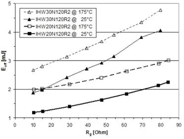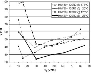 在典型飽和壓降Vce(sat)=1.6V@25℃/1.85V@175℃和典型正向電壓Vf=1.25V@175℃(額定電流)的條件下,功率損(特別是軟開關(guān)應(yīng)用的導通損耗)可大幅度降低。由IHW20N120R2的下降時間的切線可看出高速度—tf=24ns@25℃和Rg=30Ω(44ns@175℃)。IHW30120R2在下降時間方面是最為出色的:tf=33ns@25℃,Rg=30Ω;tf=40ns@175℃。(在硬開關(guān)條件下測量,參見帶有Eoff曲線的圖6和圖7)。