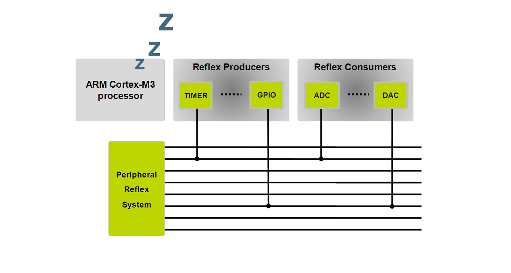 圖4. 使用Energy Micro的''''''''''''''''''''''''''''''''外圍設備反射系統'''''''''''''''''''''''''''''''' - 一個復雜的互連矩陣—完成簡單任務如開展數據轉換和存儲可執行結果、完全喚醒32位處理器內核。