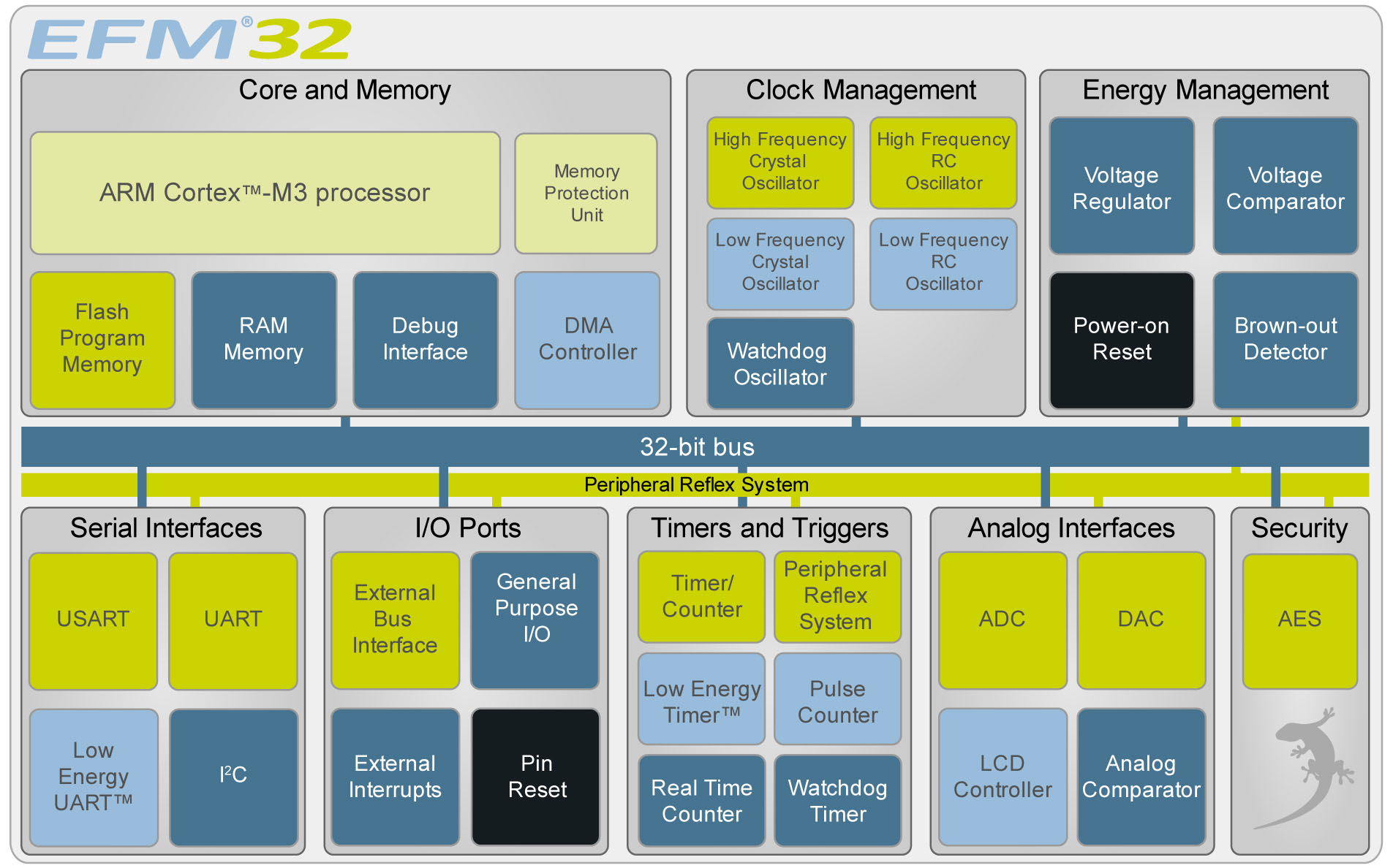 任何微處理器的電源配置包括兩個主要內容,基線力量 - 包括功能模塊使用的電源,如電壓調節器和電流偏置發生器 – 以及頻率相關因素。Energy Micro的方法是要特別注意基線功耗,在較低的頻率時這些功耗不會不受損,而某些架構會受損。