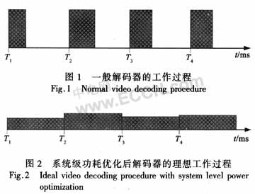 目前,在多媒體SOC設計過程中,針對其重要的視頻應用的負載特性進行功耗優(yōu)化是一個非常熱點的研究問題。常見的低功耗設計技巧主要有動態(tài)電壓調(diào)整(dynamicvoltagescale,DVS)和動態(tài)功率管理(dynamicpowermanagement,DPM)技術。在DVS技術中,在保證服務質(zhì)量的同時,讓不同計算量的任務運行在不同的工作電壓和頻率;而DPM技術則在運行過程中,動態(tài)關閉系統(tǒng)某些空閑模塊。在眾多針對多媒體應用進行低功耗設計的研究中,其主要思路可分為兩類。一種是將多媒體應用的負載當作一個隨機過程,然后采用馬爾可夫或者半馬爾可夫模型預測負載,再根據(jù)預測結果調(diào)整當前系統(tǒng)運行狀態(tài)。如在文中,提出了一種基于回歸方程的方式,通過系統(tǒng)當前“工作”和“空閑”時間預測即將到來的“工作”和“空閑”時間。分別利用離散馬爾可夫時間序列和連續(xù)馬爾可夫序列算法預測系統(tǒng)負載。以上這些方式都有效地降低了系統(tǒng)功耗開銷,但是其最大不足之處在于多媒體應用的編碼方式和內(nèi)容多種多樣,無法找到一種合適的模型來適應所有多媒體應用。另外一方面,也有研究利用實時反饋控制的方式,來調(diào)整當前系統(tǒng)運行狀態(tài)的方式來降低多媒體系統(tǒng)的功耗。