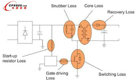 圖1給出反激式開關電源在待機狀態下的主要損耗類型,其中功率管開關損耗、驅動損耗、變壓器磁芯損耗、輸出整流管反向恢復損耗以及緩沖器損耗都屬于開關損耗。各種類型的開關損耗都與開關頻率有關,降低開關頻率可以減少開關損耗??刂齐娐返膿p耗主要表現為啟動電阻上的損耗,而啟動電阻的損耗直接與整流后的直流母線電壓和啟動電阻值。在保證寬電壓輸入的工作條件下可以通過降低啟動電流的方法來降低啟動電阻損耗。