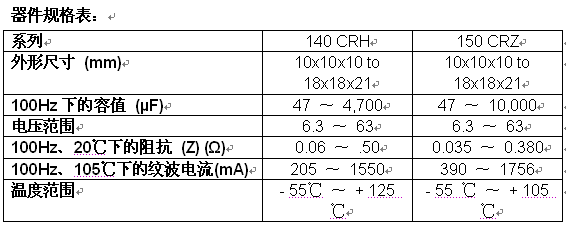 • 150 CRZ電容器具有低至0.035Ω的“Z”阻抗和高達(dá)1756mA的紋波電流