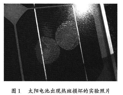 太陽電池熱斑是指太陽電池組件在陽光照射下,由于部分組件受到遮擋無法工作,使得被遮蓋的部分升溫遠遠大于未被遮蓋部分,致使溫度過高出現燒壞的暗斑,如圖1所示。熱斑可能導致整個電池組件損壞,造成損失。因此,需要研究造成熱斑的內在原因,從而減小熱斑形成的可能性。太陽電池熱斑的形成主要由兩個內在因素構成,分別與內阻和太陽電池自身暗電流大小有關。