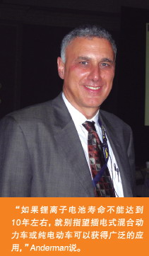 “如果鋰離子電池壽命不能達(dá)到10年左右,就別指望插電式混合動力車或純電動車可以獲得廣泛的應(yīng)用,”Anderman說。