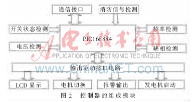 智能型雙電源開關(guān)控制器以單片機(jī)PIC16F884為核心,對兩路供電電源(常用電源和備用電源)的電壓、頻率和相位進(jìn)行實時檢測。當(dāng)其中一路電源(常用電源或備用電源)的電壓發(fā)生過壓、欠壓或是缺相時,控制器就會發(fā)出電機(jī)切換命令,使供電電源自動切換到另一路電源(備用電源或常用電源)上,以此來保障供電的連續(xù)性。控制器的工作方式主要有自動方式和手動方式兩種。控制器的結(jié)構(gòu)框圖如圖1所示,組成模塊如圖2所示。