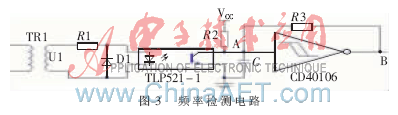 單片機(jī)對常用和備用電源進(jìn)行頻率檢測,根據(jù)檢測的結(jié)果來判斷電源是否發(fā)生故障,然后進(jìn)行相應(yīng)的控制操作。頻率檢測電路主要以光耦TLP521-1和施密特觸發(fā)器CD40106為主要器件構(gòu)成。頻率檢測的硬件電路如圖3所示。電網(wǎng)中的交流電經(jīng)變壓器后變換為電壓較低的交流信號U1,U1經(jīng)過光耦TLP521-1后就變成了同頻率的方波信號。為了防止光耦內(nèi)部的二極管被反向電流擊穿,在光耦外部反向接了1個二極管。為了使光耦輸出的方波信號更加規(guī)整,為單片機(jī)測量頻率做好準(zhǔn)備,在光耦的輸出級加了施密特觸發(fā)器CD40106。利用PIC16F884單片機(jī)的輸入捕捉(CCP)功能記錄第一個上升沿的時間t1和下一個上升沿的時間t2,則信號的周期T=(t2-t1)μs。為了提高測量的精度,采用多次測量取平均值的方法來實現(xiàn)。