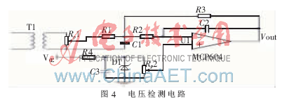 電壓檢測主要用來實時檢測常用和備用電源的電壓。PIC16F884單片機(jī)有14通道的10位A/D轉(zhuǎn)換器,可以滿足電壓采樣的精度。由于PIC16F884單片機(jī)只能對0~5V間的單極性電壓進(jìn)行檢測,故需要對交流電壓進(jìn)行提升使它成為單極性的電壓信號。電壓檢測電路如圖4所示[1]。