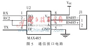 為了使控制器能夠方便地與上層控制平臺進(jìn)行聯(lián)網(wǎng)通信,實現(xiàn)控制器的遠(yuǎn)程控制、遠(yuǎn)程監(jiān)控等功能,本設(shè)計為控制器添加了通信接口,采用簡單經(jīng)濟(jì)、廣泛應(yīng)用于工業(yè)上的RS485總線與外界進(jìn)行通信。RS485采用差分信號進(jìn)行傳輸,有較好的抗干擾能力,通過轉(zhuǎn)換模塊很容易實現(xiàn)從RS485到RS232的信號轉(zhuǎn)換,從而便于和上位計算機(jī)通信。選用了Maxim公司的MAX485芯片作為通信控制的主要器件,其工作電源為+5V,采用半雙工通信方式,能夠?qū)TL電平轉(zhuǎn)換為RS485電平,內(nèi)部包含了1個驅(qū)動器和1個收發(fā)器,通過串口可以方便地與PIC16F884進(jìn)行通信。MAX485的接口電路如圖5所示。