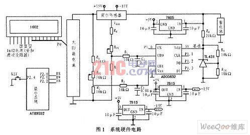單片機(jī)正常運(yùn)行需要為片內(nèi)的晶體管或場效應(yīng)管供給電源,使其工作在相應(yīng)狀態(tài)。AT89S52需要一個(gè)5V電源(實(shí)際工作電壓為3.6~6.0V)。可用整流、穩(wěn)壓方式供電,獲得4.5V左右的電壓,因本系統(tǒng)為獨(dú)立發(fā)電,且長期使用,考慮到電源壽命,該裝置由市電或干電池提供驅(qū)動(dòng)電源不符合實(shí)際,所以最佳方案應(yīng)該由系統(tǒng)內(nèi)部太陽能電池的蓄電池供電,經(jīng)穩(wěn)壓集成塊7805穩(wěn)壓為5V,輸入單片機(jī)Vcc引腳,驅(qū)動(dòng)單片機(jī)及液晶顯示裝置。TBCl0SY霍爾電流傳感器,需±15V雙電源供電,同樣采用系統(tǒng)內(nèi)的蓄電池供電.經(jīng)穩(wěn)壓集成塊7805、7915穩(wěn)壓在±15V,從而驅(qū)動(dòng)其工作。