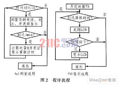 電量計(jì)算公式為Q=UIT,其中時(shí)間T可根據(jù)需要在軟件編程時(shí)自行確定,如每隔3min采樣一次,經(jīng)內(nèi)部運(yùn)算后送1602液晶顯示發(fā)電量。為了節(jié)約電能,通過設(shè)置繼電器,使液晶顯示器顯示10s后自動(dòng)熄滅。