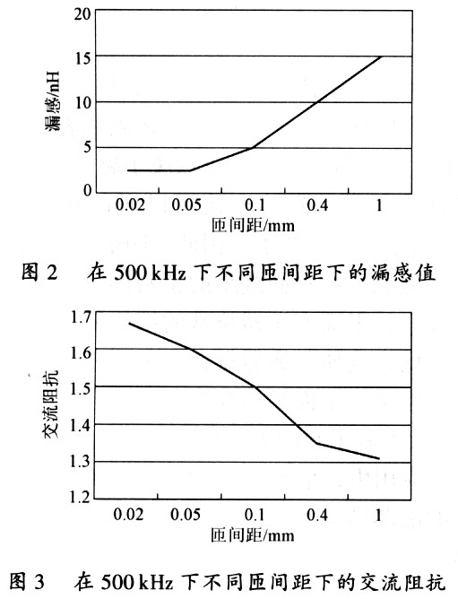 圖2與圖3給出了在不同的間隙下漏感和交流阻抗的變化,可以明顯地看出間隙越大,漏感越大,交流阻抗越小。在間隙增加1mm的狀況下漏感值增加了5倍之多。因此,在滿足電氣絕緣的情況下,應該選用最薄的絕緣體來獲得最小的漏感值。