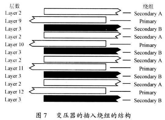 插入技術是指在布置變壓器原、副邊繞組時,使原邊繞組與副邊繞組交替放置,增加原、副邊繞組的耦合以減小漏感,同時使得電流平均分布,減小變壓器損耗。