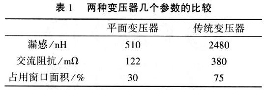 為了比較平面變壓器和傳統變壓器,分別做了兩種變壓器的模型,一種使用平面結構并使用了插入技術,另一種使用銅線分別在初級和次級繞制而成。兩種變壓器都被運用于一個互補控制的半橋變換器中。兩個變壓器的參數如下: