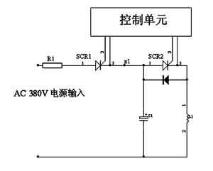 控制原理是:首先通過380V交流電給C1充電,正半周SCR1導通,完成充電過程,負半周SCR1自動截止,C1電壓一直保持到下一個正半周期信號到來。此時開通SCR2,使C1、L1形成回路,產生自由震蕩并完成放電。如此反復循環,即達到了理想的磁場波形。