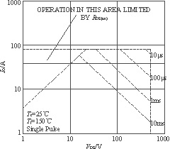 檢測電纜絕緣中,通常需要的直流電壓為50V,這樣,設定中性點的接地電阻最小值為5Ω,通過歐姆定律我們可以得出,直流電源至少要能夠提供10A的電流;此外,考慮到在測量過程中需要的開關速度,就可以選擇合適的電力電子器件了。經過對常用全控型電力電子器件的考察,我們決定采用MOSFET來作為開關器件,選用IR公司的IRFP460。IRFP460是IR公司生產的高速器件,它的安全工作區如圖2所示,在圖2中我們可以看出,在50V的情況下,10A是它可以安全關斷的電流[3]。