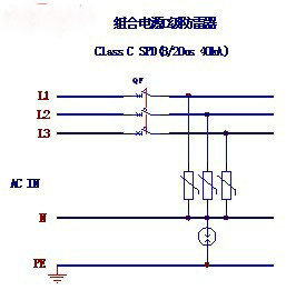 對于站內(nèi)組合電源系統(tǒng)的防雷,其防雷電路比較簡單,也比較成熟,根據(jù)‘郵標(biāo)’,在組合電源系統(tǒng)交流側(cè)采用通流容量為40kA(8/20μS波形)的 “3+1”方式的交流C級防雷器,在組合電源的直流側(cè)采用通流容量為15kA(8/20μS波形)的“1+1”方式的直流防雷器即可。
