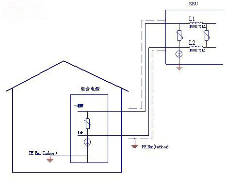 注:① 如果組合電源內(nèi)部沒有配置合適的直流防雷器,則應(yīng)該在RRU電源線引出機(jī)房處加裝一級直流防雷箱;