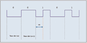 S/PDIF協(xié)議——如上文所述,它是一種單線串行接口,時鐘嵌入數(shù)據(jù)之中。傳輸?shù)臄?shù)據(jù)采用雙相標(biāo)記編碼。時鐘和幀同步信號在接收器端與雙相解碼數(shù)據(jù)流一同恢復(fù)。數(shù)據(jù)流中的每個數(shù)據(jù)位都有一個時隙。時隙以一個躍遷開始,并以一個躍遷結(jié)束。如果傳輸?shù)臄?shù)據(jù)位是“1”,則時隙中間還會增加一個躍遷。數(shù)據(jù)位“0”則不需要額外躍遷,躍遷之間的最短間隔稱為單位間隔(UI)。