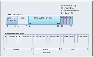 S/PDIF幀格式——首先驅(qū)動數(shù)據(jù)的最低有效位。每個幀有兩個子幀,分別是32個時隙,共64個時隙(見圖2)。子幀以一個前導(dǎo)碼開始,后面跟隨24位數(shù)據(jù),最后以攜帶用戶數(shù)據(jù)和通道狀態(tài)等信息的4位結(jié)束。子幀的前4個時隙稱為前導(dǎo)碼,用于指示子幀和塊的開始。前導(dǎo)碼有三個,每一前導(dǎo)碼均包含一個或兩個持續(xù)時間為3UI的脈沖,從而打破雙相編碼規(guī)則。這意味著,該模式不可能存在于數(shù)據(jù)流中的其他地方。每個子幀都以4位前導(dǎo)碼開始。塊的開始用前導(dǎo)碼“Z”和子幀通道的開始“A”表示。前導(dǎo)碼“X”表示通道“A”子幀的開始(不同于塊的開始),前導(dǎo)碼“Y”表示通道“B”子幀的開始。