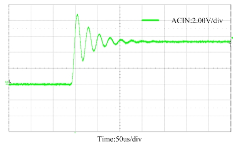 而在適配器熱插拔時(shí),也會(huì)出現(xiàn)瞬態(tài)的過壓電壓,由于適配器連接線的寄生電感效應(yīng),熱插拔時(shí)會(huì)產(chǎn)生瞬態(tài)的輸出振蕩波形,經(jīng)過一段時(shí)間的衰減后會(huì)穩(wěn)定在DC值。圖2為5.5V適配器熱插拔時(shí)的瞬態(tài)波形,通常適配器熱插拔時(shí)產(chǎn)生的瞬態(tài)過壓峰值電壓是其DC值的兩倍左右。