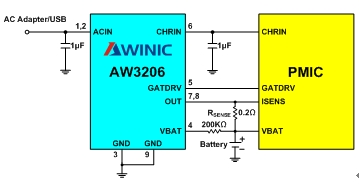 AW3206和AW3208的輸入引腳ACIN到地需要一個(gè)不小于1uF的輸入電容。這個(gè)輸入電容除了去耦外,還可以有效減小適配器在熱插拔時(shí)由于連接線的寄生電感效應(yīng)產(chǎn)生的瞬態(tài)過沖電壓。另外這個(gè)電容建議選取耐壓不低于15V的X7R或X5R陶瓷電容。