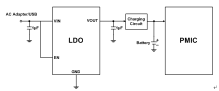 但在標(biāo)準(zhǔn)的諾基亞適配器中,有很大一部分適配器的輸出電壓是高于7V的,圖3是諾基亞適配器AC-3C的輸出特性曲線,從圖中可以看出,AC-3C的輸出電壓在空載時(shí)為7.5V,而有的諾基亞充電器的輸出電壓會(huì)高達(dá)8~9V。為了適應(yīng)諾基亞適配器,曾有如圖5所示的用高壓LDO設(shè)計(jì)的手機(jī)充電系統(tǒng)方案: