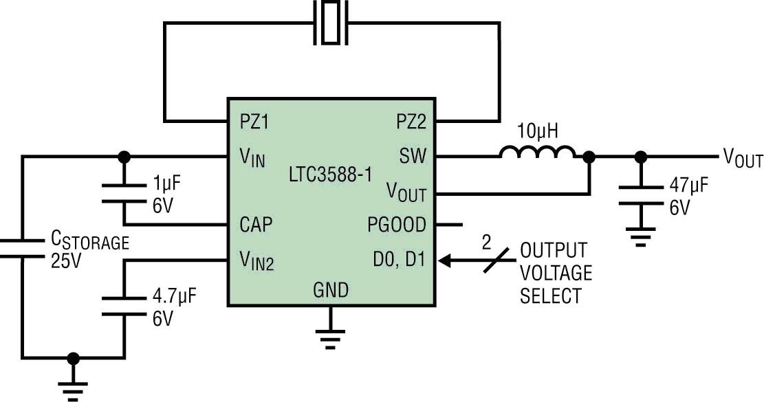 LTC3588-1 是一款完整的能量收集解決方案,專為包括壓電式換能器在內的低能量源而優化。壓電器件通過器件的擠壓或撓曲產生能量。視其尺寸和構造的不同,這些壓電元件能產生幾百 μW/cm2 的功率。