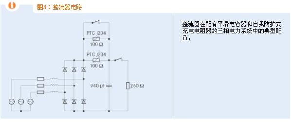 [page]上述電路采用三相橋式整流器,并將其接至相導線電壓為400 VRMS的電源中。其中平滑電容器的電容為940 μF。并聯電路含有兩個B59204J0130B010型充電電阻器,用于限定沖擊電流。亦稱為零電位電阻器,其額定電阻在25℃的環境溫度下為100 ?。在這種情況下,需要并聯兩元件:因為電能必須在充電期間內傳到電容器,這會使單個B59204J0130B010電阻器開始發熱,直至溫度高出允許范圍,結果便導致電阻大大加強。這一情況應當避免,否則將無法對鏈路電容器進行徹底充電。