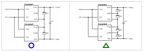 圖2-2為兩個雙路輸出電源模塊串聯接線方式,因此,可得到四組Vout相加后的輸出電壓。單一個雙路輸出電源模塊,其兩組輸出之啟動時間是一致的,故僅需在+/-Vo1及+/-Vo2各并上二極管即可,如圖左所示。在上圖中,輸出端共并上4顆二極管,此方式亦可行,但較浪費成本。串聯后的輸出電壓,可再加上輸出電容,用以降低因兩電源模塊差頻所造成的Ripple & Noise。